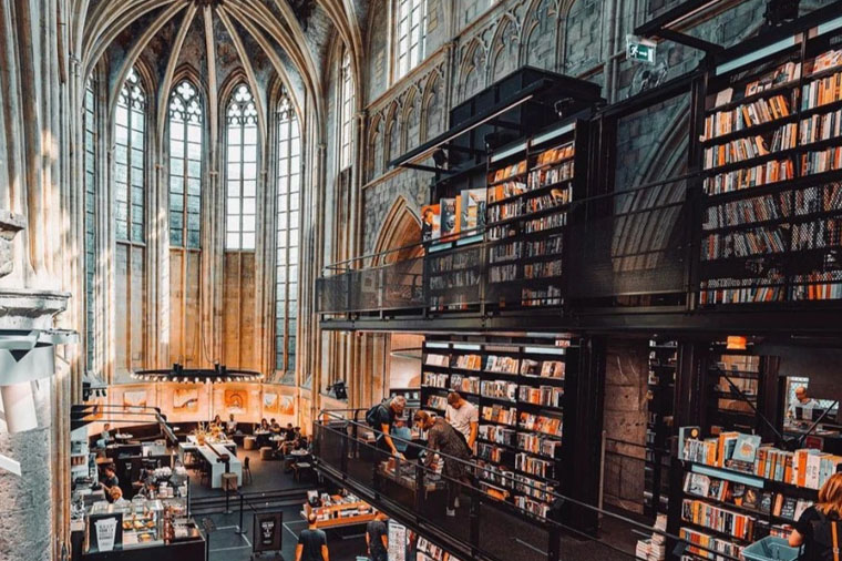 【天堂書局Book Store Dominicanen】又稱為教堂書局,由800年歷史的教堂改造而成,法國大革命時曾被法軍占領,之後就不再作為教堂使用,有時是倉庫,有時是工廠,也曾經是腳踏車停車場。2004年與荷蘭書商合作,保留教堂原有的穹頂天花板、拱型門廊以及大理石巨柱,將內部改建為書局。教堂原先的主祭壇位置,則獨立規劃成咖啡廳,中間的大咖啡桌則是以十字架形式呈現,並在座位四周點上蠟燭,增添不少神聖氣息,2007年榮獲室內建築大獎,英國《衛報》評價其為世界上最漂亮的書局。