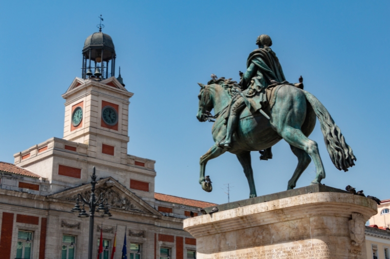 當個馬德里人,漫遊在地市集。太陽門廣場位於馬德里市的中心位置,也是西班牙公路網的中心點,周圍則有十條道路以其為中心呈放射狀延伸,周遭則環繞了許多百貨公司與商家,是馬德里市區最繁忙的商圈,甚至每年的跨年會場都於此舉行,依照傳統,跨年時會伴隨著十二聲響鐘下吃下十二顆葡萄,相當有意思。
