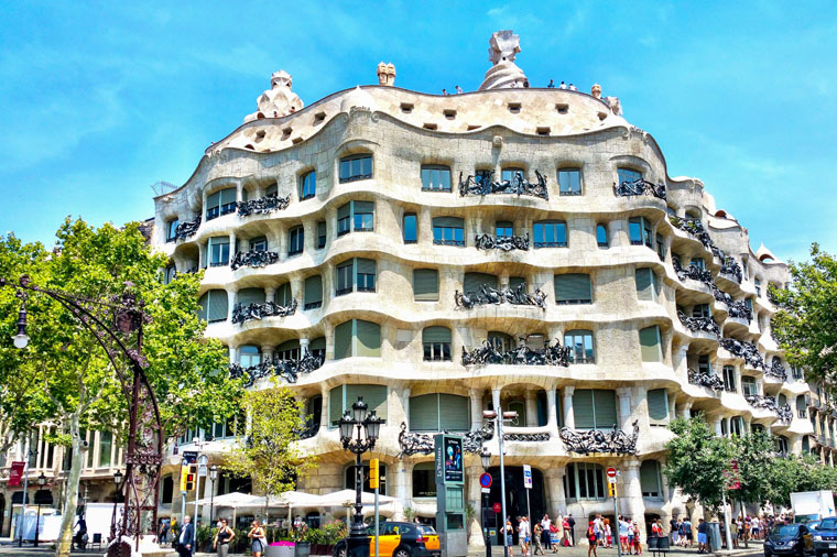 全日巴塞隆納市區觀光。富豪佩雷米拉(Pere Milà)因非常欣賞巴特婁一案而委託高第設計的住宅大樓,同時也是高第的最後一件私人住宅作品;其特殊之處除了在於建築重量完全由柱子承受的結構設計,讓每間房子都得以享受大面積的採光玻璃,以及更具彈性隨意的空間改造,讓米拉之家的內部每一戶都能雙面採光,光線由採光中庭和外面街道進來,而房間的形狀也幾乎全是圓型設計,天花板、窗戶、走廊,幾乎沒有矩形的設計。米拉之家於1984年被列為世界遺產,同時宛若外星生物般、有趣的屋頂與煙囪設計,更據傳是大導演喬治盧卡斯發想《星際大戰》(Star Wars)系列作品的靈感來源