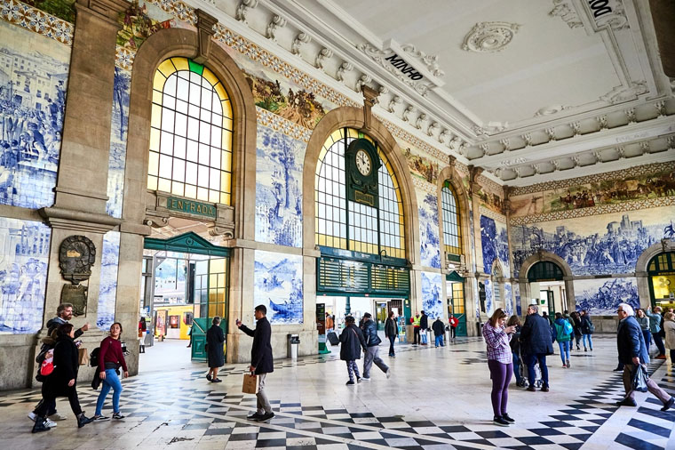波多最富盛名的火車站,被稱為全世界最美麗的火車站之一,由建築師何塞·達席爾瓦設計,名稱源於16世紀的本篤會修道院,法式風格外觀已讓人嘆為觀止,走進火車站內更讓人驚嘆不已。車站大廳除了搭車的旅客外,特地慕名而來的朝聖者更是絡繹不絕,站內裝飾著滿滿兩萬塊精緻藍白色陶瓷磁磚牆面,訴說著葡萄牙的歷史故事。
