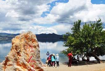 【情人灘】是一大片坡地,延伸到湖裡成為水草密佈的濕地。由於信仰的關係,人們在松林和草地上掛起經幡,迎風招展,格外給人以許多神秘的感覺。傳說天神施法將格姆和後龍化成兩座山後,他們只能隔海相望,天神只允許他們在農曆七月十五那一天相會,每當這一天,格姆和後龍就在情人灘邊相依相偎,訴說衷腸。
