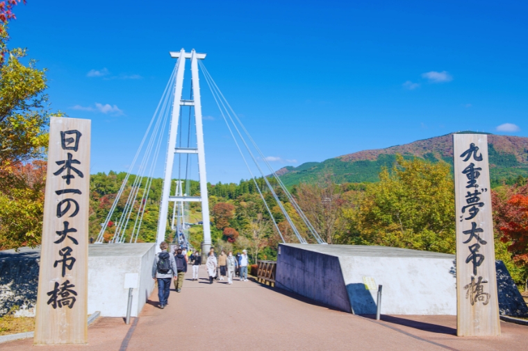 【九重夢大吊橋】日本最高的吊橋,它坐落在水面高173公尺處,長390公尺,是日本第一高的行人專用吊橋。站在橋上,可欣賞到「九醉溪谷」、「震動瀑布」等優美景色。