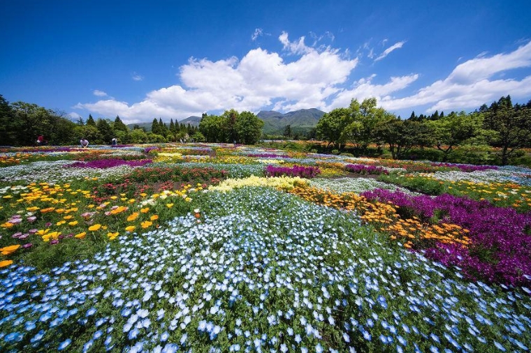 大分縣竹田市九重花卉公園位於阿蘇國立公園內的九重台地。這裡是一座一年四季皆可以欣賞美麗自然風光的花卉公園,以日本百座名山之一的九重山脈和遠處的阿蘇五峰為背景,可以欣賞到500種,500萬株各色鮮花!