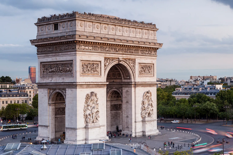 【巴黎凱旋門<下車參觀>】凱旋門是拿破崙為紀念1805年打敗俄奧聯軍的勝利,於1806年下令修建,期許下次打勝仗回來,能帶著軍隊風光的走過凱旋門,但經過了三十年凱旋門才終於完工。拿破崙在滑鐵盧戰役失敗後,被流放到小島上,就這樣在小島上度過了餘生,直到他死後九年,法國才圓了他經過凱旋門回到巴黎的夢想,只可惜不是他自己親自走過,而是躺在棺木中。