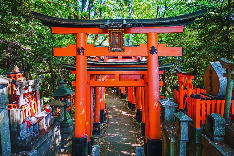 據史書記載建於和同4(公元711)年,是日本全國各地四萬所稻荷神社的總社。稻荷神社主要是日本人信奉的保佑商業繁榮昌盛、五谷豐收之神的所在地。 伏見稻荷大社位於稻荷山,由樓門、本殿、千本鳥居等構成,綠樹掩映深處,一條看似隧道、由千座朱紅色鳥居構成的神祕通道最讓人印象深刻,直通稻荷山山頂,是京都獨特風景的代表之一。每年舉行歲旦祭、稻荷祭、節分祭、田植祭等多種祭祀活動。