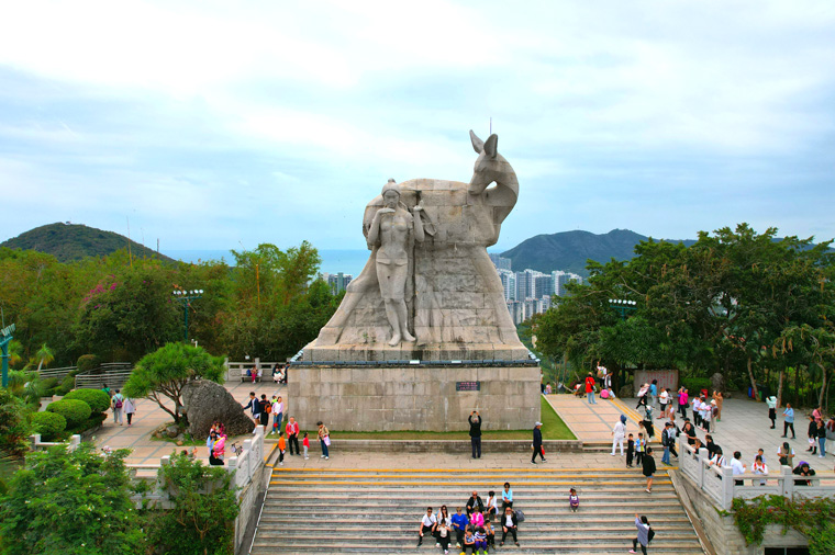 【鹿回頭公園】是中國海南省三亞市的一個公園,是位於市中心區南面三亞河對岸伸入海中的一座小山,整個三亞的制高點,在這裡可以俯瞰北面的三亞市中心區和東面的大東海海灘,並遠眺南面一望無際的南海。山頂上樹立一座12米高的石雕,表現青年獵手和回頭梅花鹿變成美麗少女的故事。