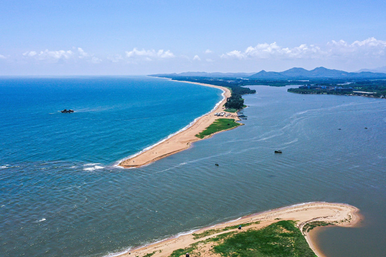 【玉帶灘】是瓊海市博鰲鎮的一處沙灘半島,遊客只能坐遊船前往。站在狹長的玉帶灘上,一側是南海,一側是河流交匯處,景色非常奇特。由於南海的浪較大,下水游泳比較危險,遊客一般選擇只在沙灘上玩耍,欣賞河與海交匯處的獨特景觀。