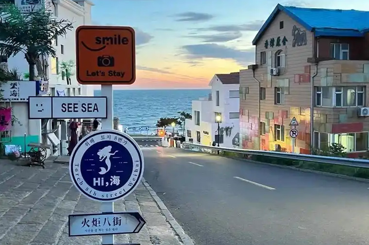 一條筆直而悠長的街道,兩邊是鱗次櫛比的異國情調的建築,盡頭是碧藍的威海灣。街道的兩側,各種創意小店、藝術工作坊錯落有致,每一家店都充滿了設計師們的獨特創意,每一家店都有一個故事,等待著你去發現。