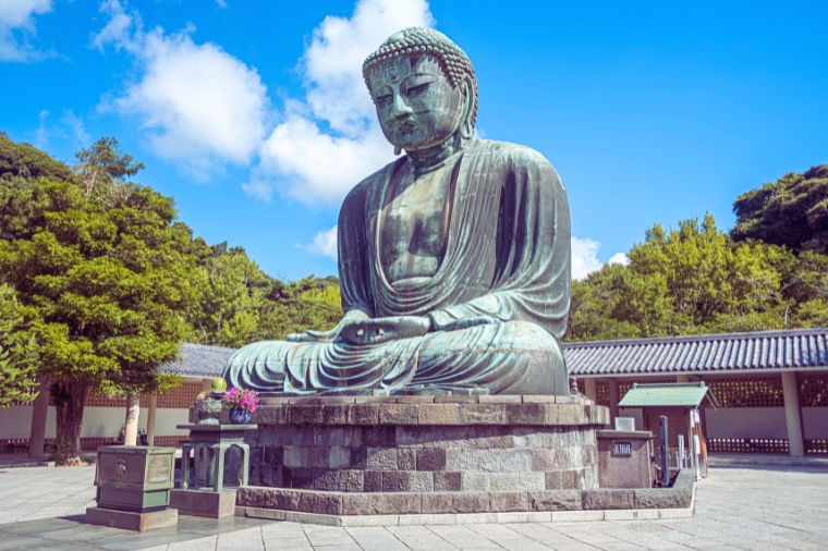 坐落高德院內,聳立在遊客面前。高12公尺,光是臉部就有2.3公尺,重達121公噸。從1238年開工,花費了6年的時間木雕大佛修建完工,到 1252 年開始修建為金佛。為現存鎌倉的佛像之中唯一的國寶;也因為日本歌人與謝野晶子的歌詠於是大佛也有「美男」的美稱。