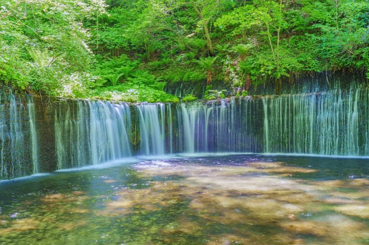 天然美景芬多精 「白系瀑布」 位於輕井澤的白系瀑布寬度約100公尺,沿著岸壁流下,宛如一批純白的絹布,白系瀑布獨有的神秘氣質與唯美的景緻,也讓它擁有「輕井澤的祕境」之稱。